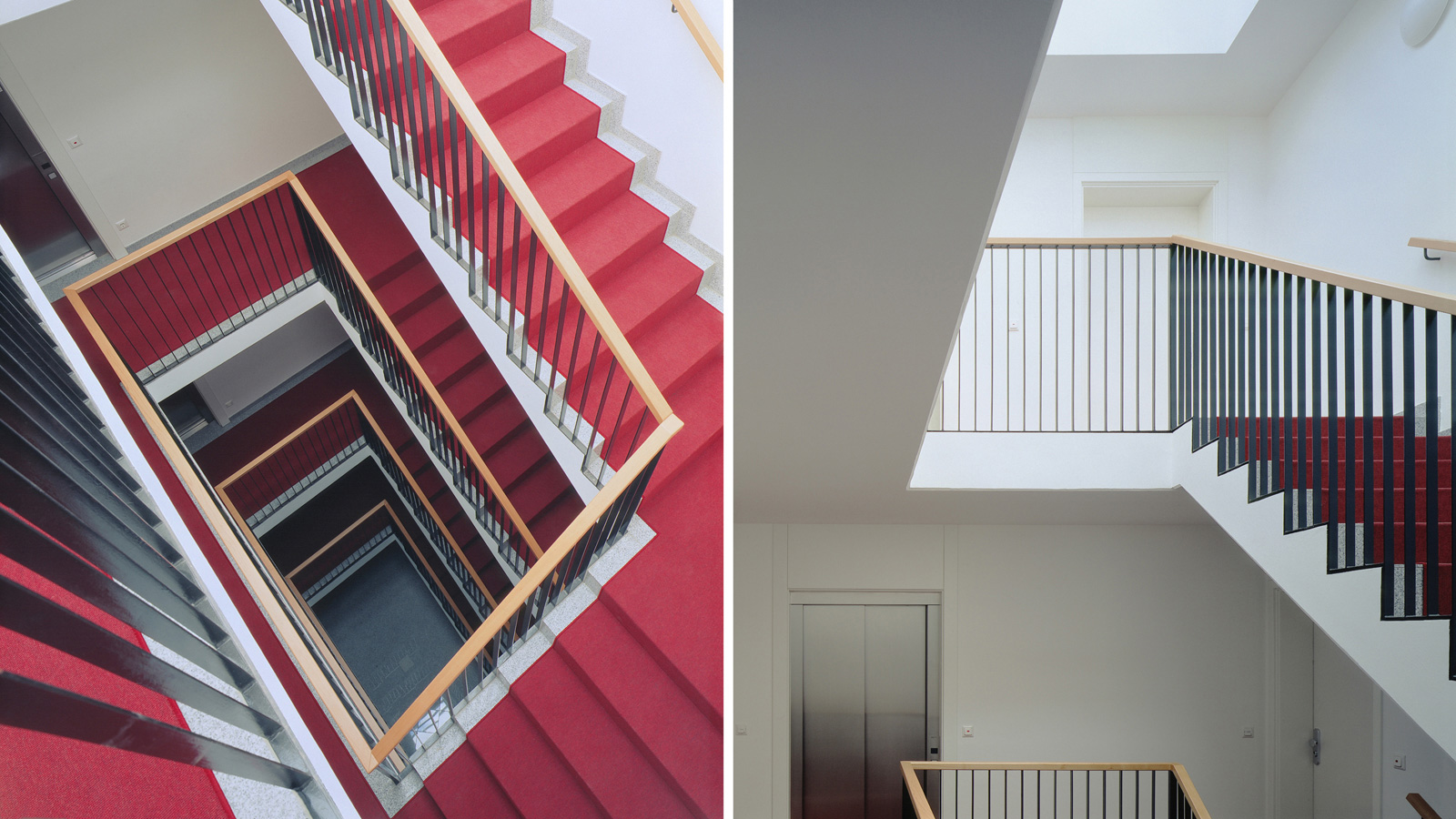 Der konzeptionelle Umgang mit den öffentlichen und halböffentlichen Räumen ist wichtiger Bestandteil des Entwurfes. Die Einfriedung zum Straßenraum, ein prominenter Hauseingang und ein großzügiges von oben natürlich belichtetes Treppenhaus zeugen davon.