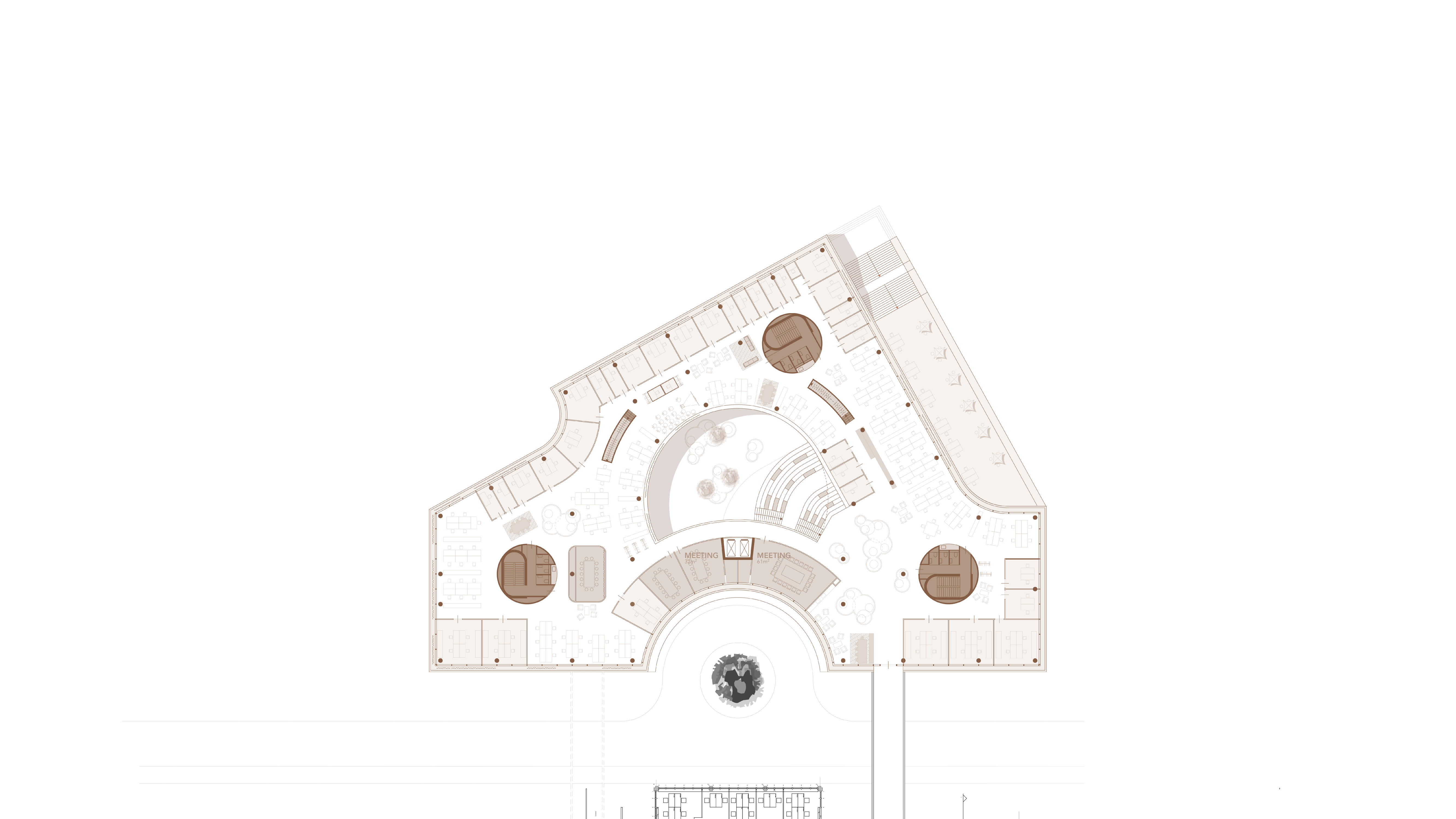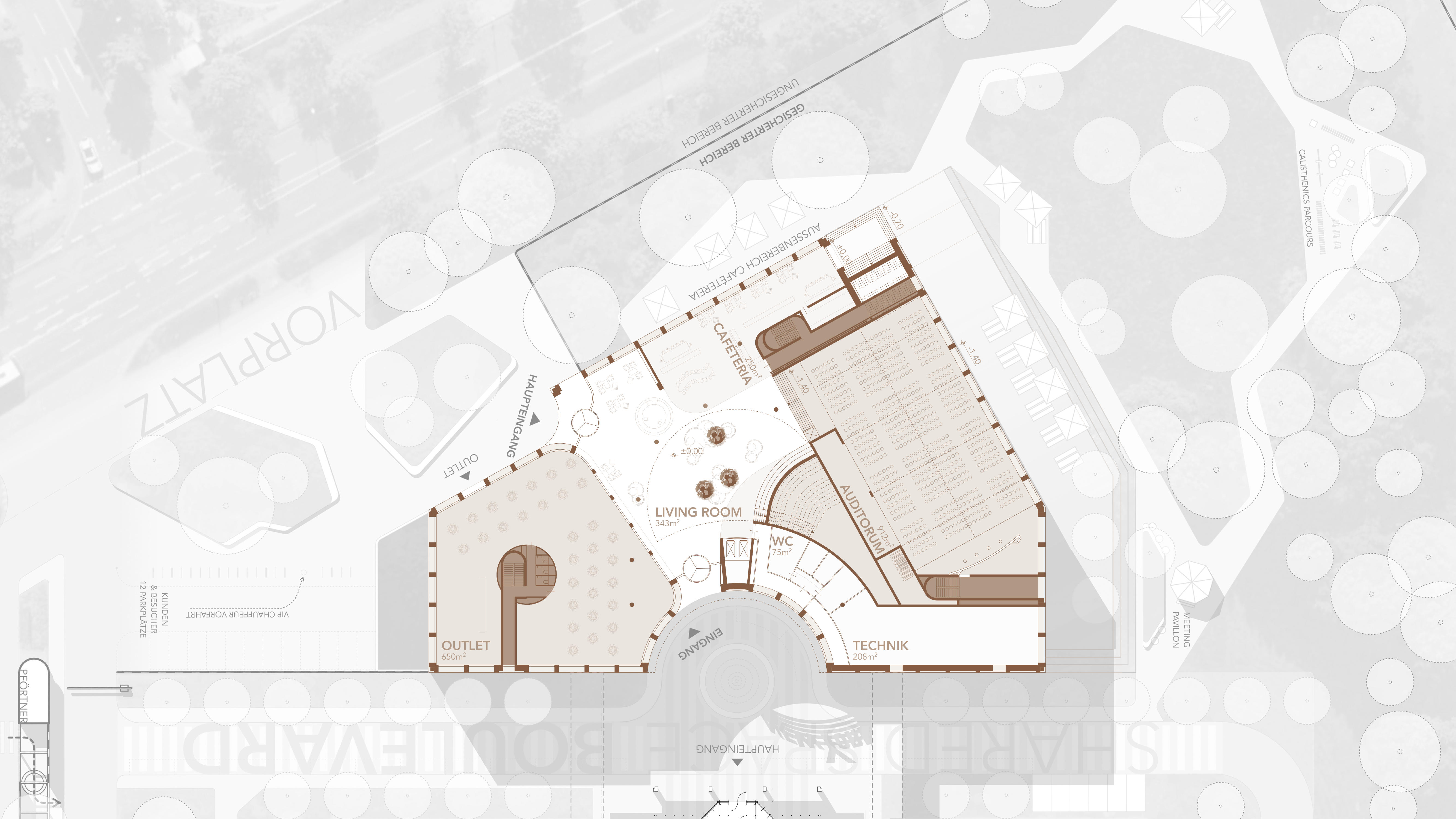 Bestandsgebäude und nutzt die bestehende Vorfahrtsituation als gemeinsame straßenübergreifende interne Eingangsgeste. Durch einen
